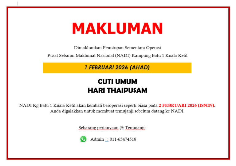 Tarikh : 20 & 22 Januari 2026 Masa : 10.00 pagi – 11.00 pagi Tempat : NADI Kg Batu 1, Kuala Ketil